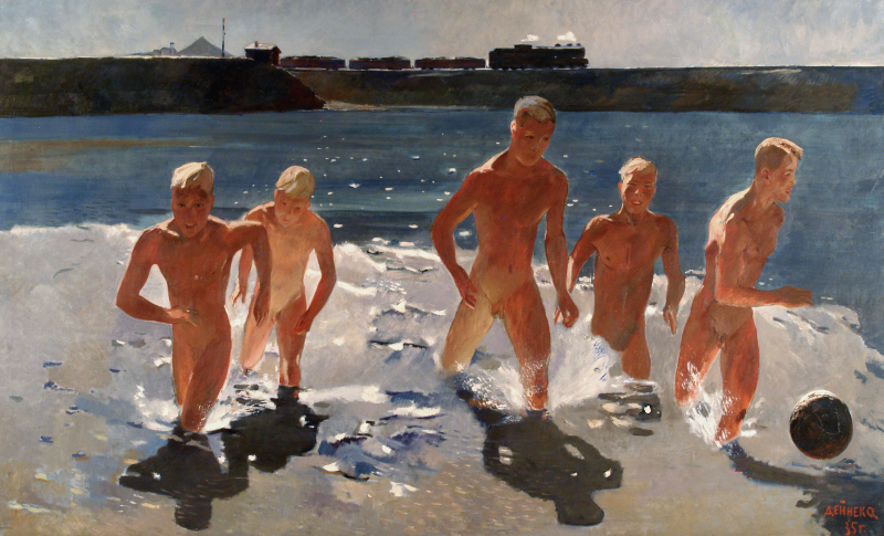 Adoptant les codes du réalisme socialiste, Deïneka donne à voir les bienfaits des activités de plein air et la vigueur de la jeunesse. Au risque de heurter les tabous de la société stalinienne, il n’hésite pas à mettre en scène la nudité des corps qui, dans un collectif non-mixte, suggère une forme d’homoérotisme empreinte de sensualité. Les jeunes gens batifolant dans l’eau scintillante de la Pause déjeuner dans le Donbass (1935) évoquent un âge d’or prolétarien et préfigurent un avenir enchanteur. Mais le schématisme des corps et l’inachèvement des visages montrent que pour Deïneka le socialisme relève encore davantage du rêve que de la réalité.
