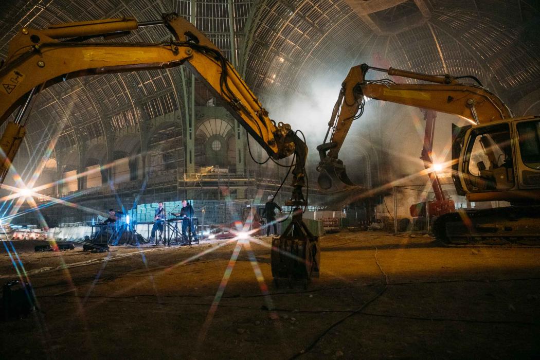 En pleine nuit, traversée de lumière électrique, la Nef baigne dans une ambiance irréelle. L’activité du chantier a laissé la place à la préparation, tout aussi intense, de l’événement à venir. Les musiciens sont déjà enveloppés de lumière lorsque le clap de début retentit sur le chantier. Très vite, la verrière s’anime, dans un spectacle électrique et puissant.