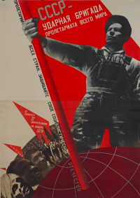 Vous saviez que le cyrillique était un alphabet bicaméral de trente lettres créé en Bulgarie à la fin du IXe siècle, mais on va quand même vous aider à traduire ce qui est écrit sur cette affiche de Klutsis, parce qu'on est sympa : "L’URSS est la brigade de choc du prolétariat mondial". De rien, c'est cadeau !