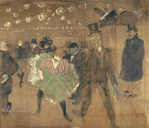 Les contemporains s’accordaient pour désigner la Goulue reine du cancan. En 1895, elle quitte la salle du Moulin-Rouge pour la foire du Trône où elle présente un spectacle de danse du ventre. Elle demande alors à son ami Toulouse-Lautrec de peindre les deux panneaux de sa baraque. Le trait radicalement nouveau de Lautrec, familier du monde interlope des cabarets, tranche avec la tradition picturale initiée par Chéret et poursuivie par Meunier.
