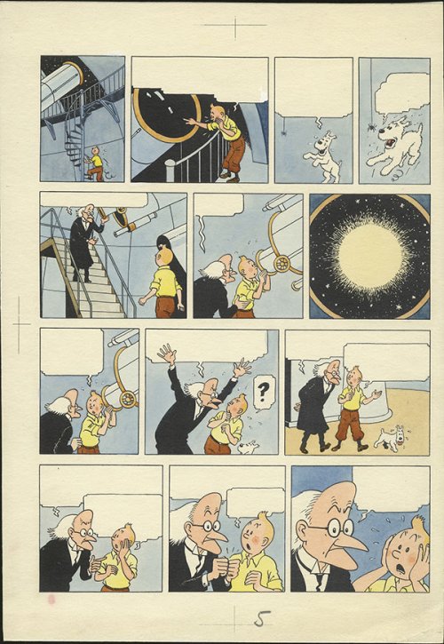 "Les premières parutions des Aventures de Tintin (et ce jusqu’au Sceptre d’Ottokar en 1939) furent structurées par l’encrage du trait noir, l’aplat encré et la trame grise de la photogravure. Pressé par son éditeur, Casterman, de passer à la couleur (pour des raisons commerciales évidentes), Hergé lui résista un temps avant de céder à contrecœur. Et pourtant, la première aventure de Tintin éditée en couleur, en 1942, est un chef-d’œuvre chromatique : les accords d’azur et d’ocre de L’Étoile mystérieuse vibrent selon un climat d’abord torride, puis glacial. Cet accord de bleu-brun clair étant celui-là même des grands peintres de la Renaissance depuis Giotto... Hergé coloriste débuta prudemment, comme un peintre classique, par la pastellisation de ce contraste parfait."