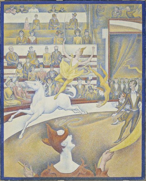 Félix Fénéon, un critique d'art défend les innovations de Seurat. Il écrit un article qui devient le manifeste du mouvement. Au musée d'Orsay, tu peux voir une toile très connue de Seurat: le Cirque. Il la peint en 1891. Il y applique sa touche et sa théorie des couleurs. Le thème reste proche des sujets impressionnistes, une scène de spectacle. Tu peux voir les comédiens et les spectateurs.
