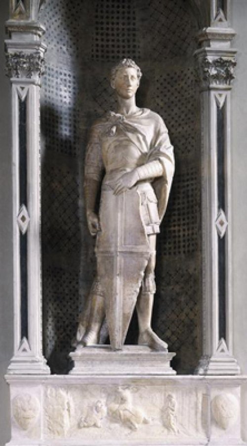 Ami de Brunelleschi, il part avec lui à Rome étudier les modèles antiques. Lui aussi se préoccupe de l’occupation de l’espace et du rendu des expressions mais en sculpture. Il est protégé des Médicis et travaille à la décoration de la cathédrale de Florence. Ce saint Georges est une oeuvre de jeunesse. L'attitude du guerrier est naturelle, son regard montre du courage. Il va affronter le dragon. Sur le socle de la stature, Donatello sculpte ce combat en bas relief.