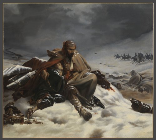 L’Épisode de la Campagne de Russie (ci-contre) représente le désarroi des soldats lors de la retraite de Moscou. Les deux hommes en premier plan sont accablés par le froid, le manque de nourriture et les blessures. Ni leur uniforme, ni leur équipement ne permet de distinguer le régiment dans lequel ils servent. Épuisés, ils ne peuvent plus combattre ; ils attendent la mort qui apparaît sous les traits des cavaliers cosaques en arrière-plan.